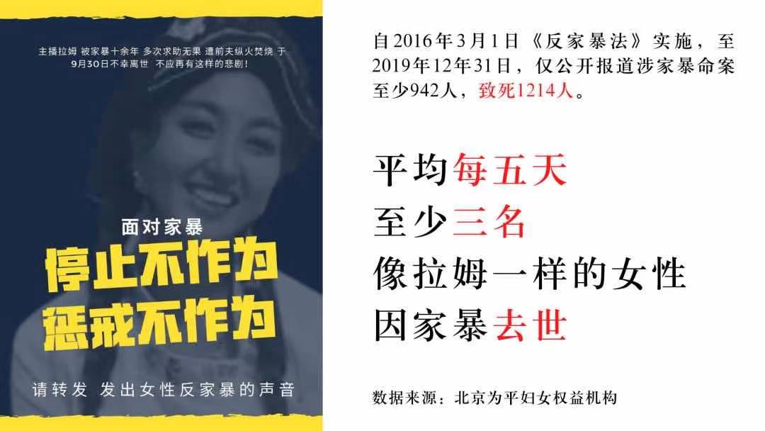 第一类是名人效应,如影视明星蒋劲夫殴打女友、美妆博主宇芽披露男友家暴自己和前任、短跑名将张培萌被爆殴打妻子等;第二类是发生重大伤亡,如2020年发生的杭州来女士被丈夫杀害分尸案、四川安岳杀妻案和父母残酷虐待子女的辽宁抚顺亲生母亲虐待6岁女儿致其二级重伤案件;第三类是公共场合发案立即成为舆情事件,如广东一女子因离婚被丈夫在民政局门前殴打,云南一女子与丈夫去离婚的路上被丈夫摔到桥下受重伤等案件。其中,四川的短视频博主拉姆直播自己在厨房做饭时,前夫冲进来殴打她并点燃汽油,最后拉姆烧伤不治身亡,这起案件得到了线上线下的强烈关注,并产生“拉姆法案”的公众呼吁。